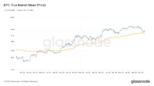 First, the True Market Mean, represents the average onchain purchase price of bitcoin held by active market participants. It focuses on coins that have moved recently, filtering out long dormant supply, and therefore reflects the cost basis of investors who are most likely to trade.